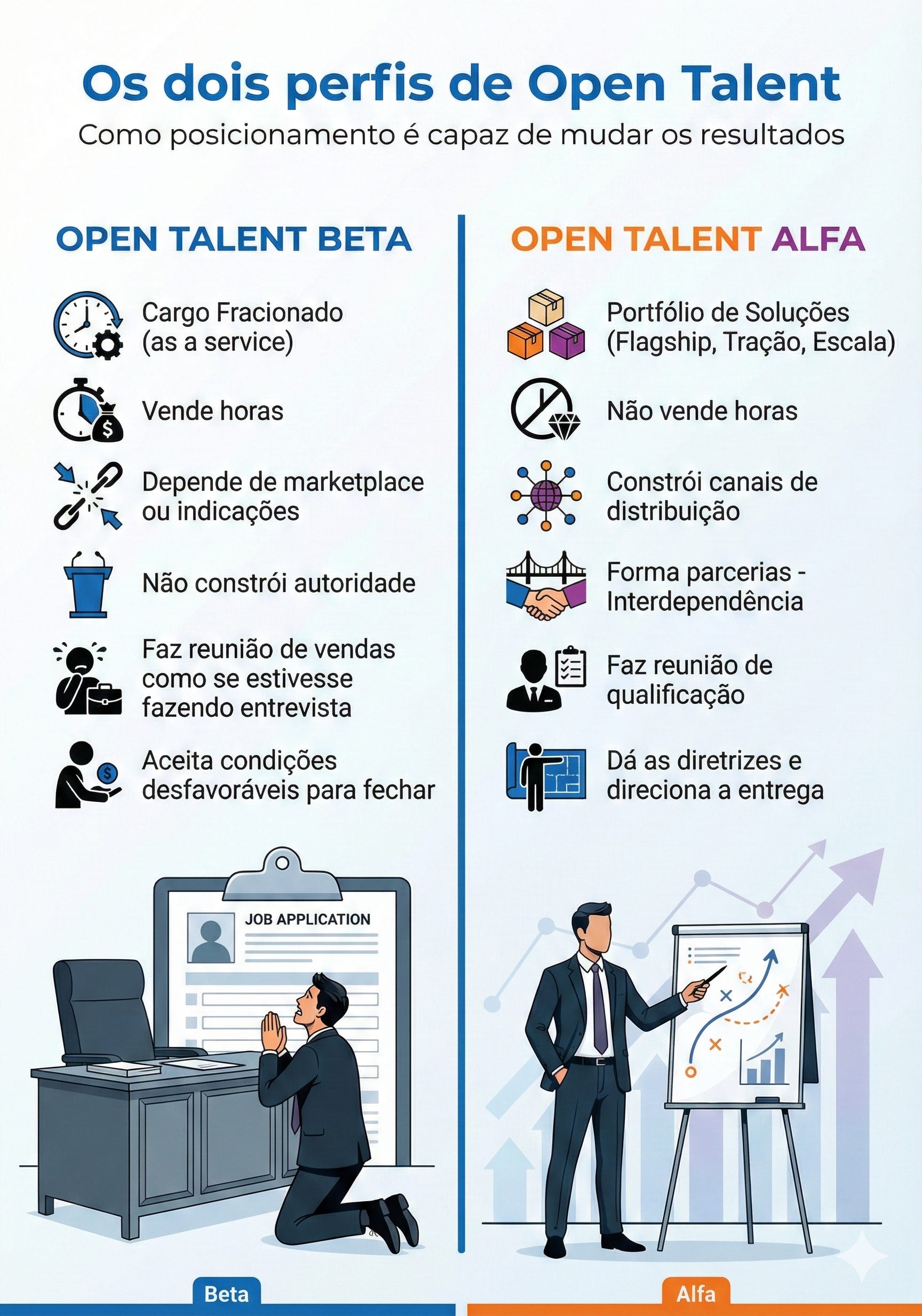 Do outro lado, temos o Open Talent Alfa. Este profissional entendeu que ele não é um “candidato”, ele é um Negócio de Uma Pessoa Só.