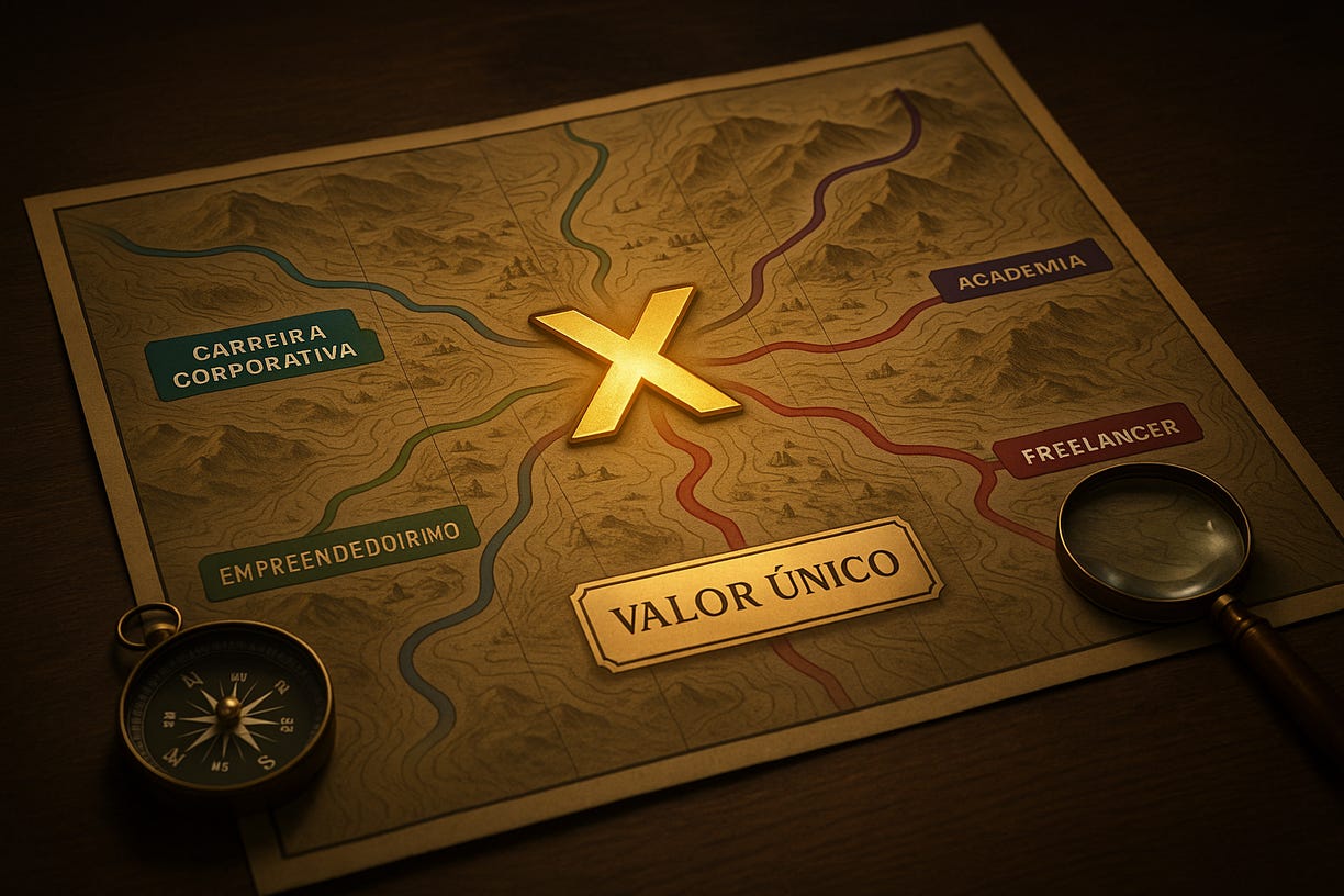 O primeiro passo é mapear seu valor único. Descobrir que problema você resolve melhor que qualquer pessoa no planeta. Quando você tem essa clareza, tudo fica mais fácil.